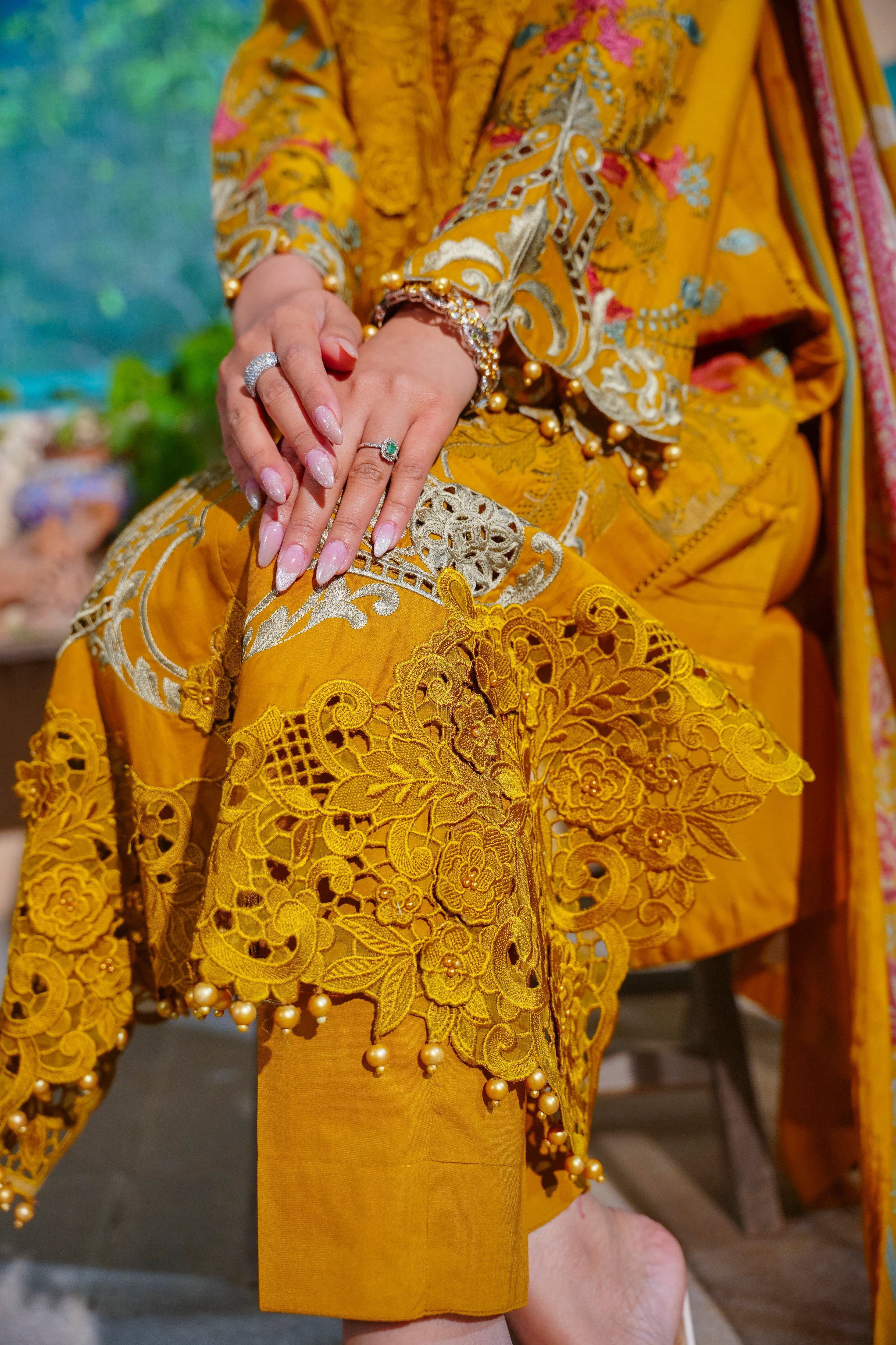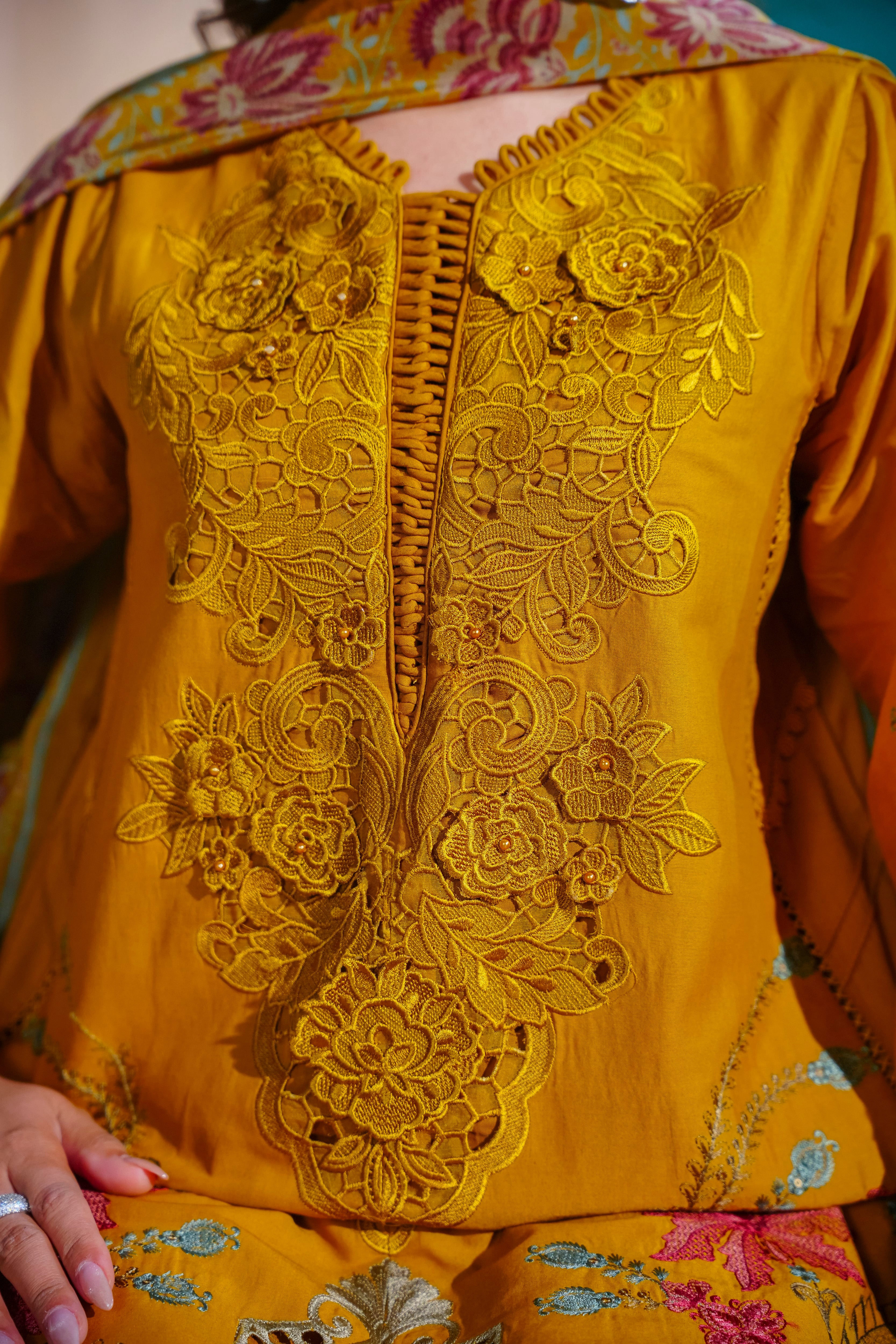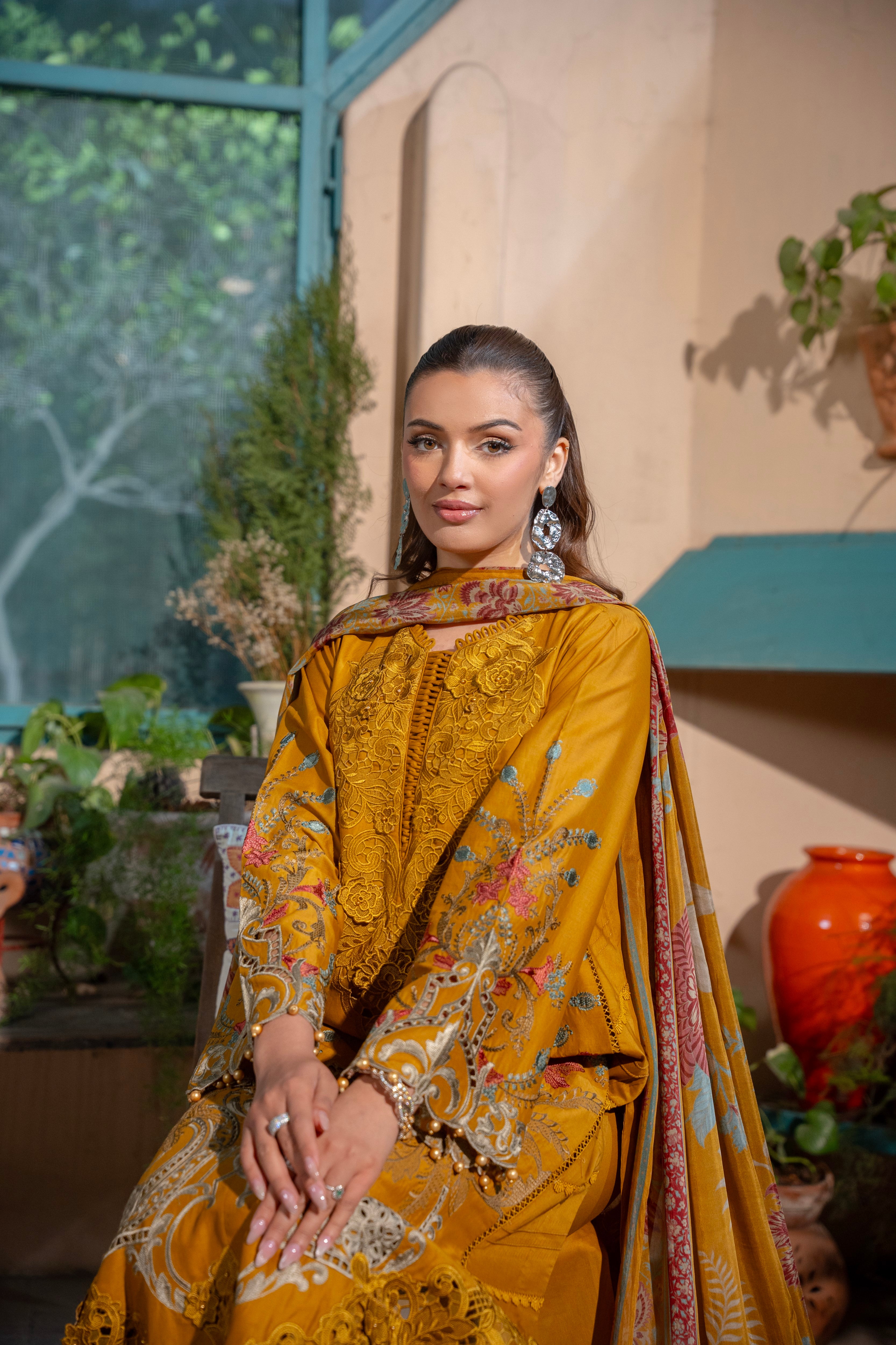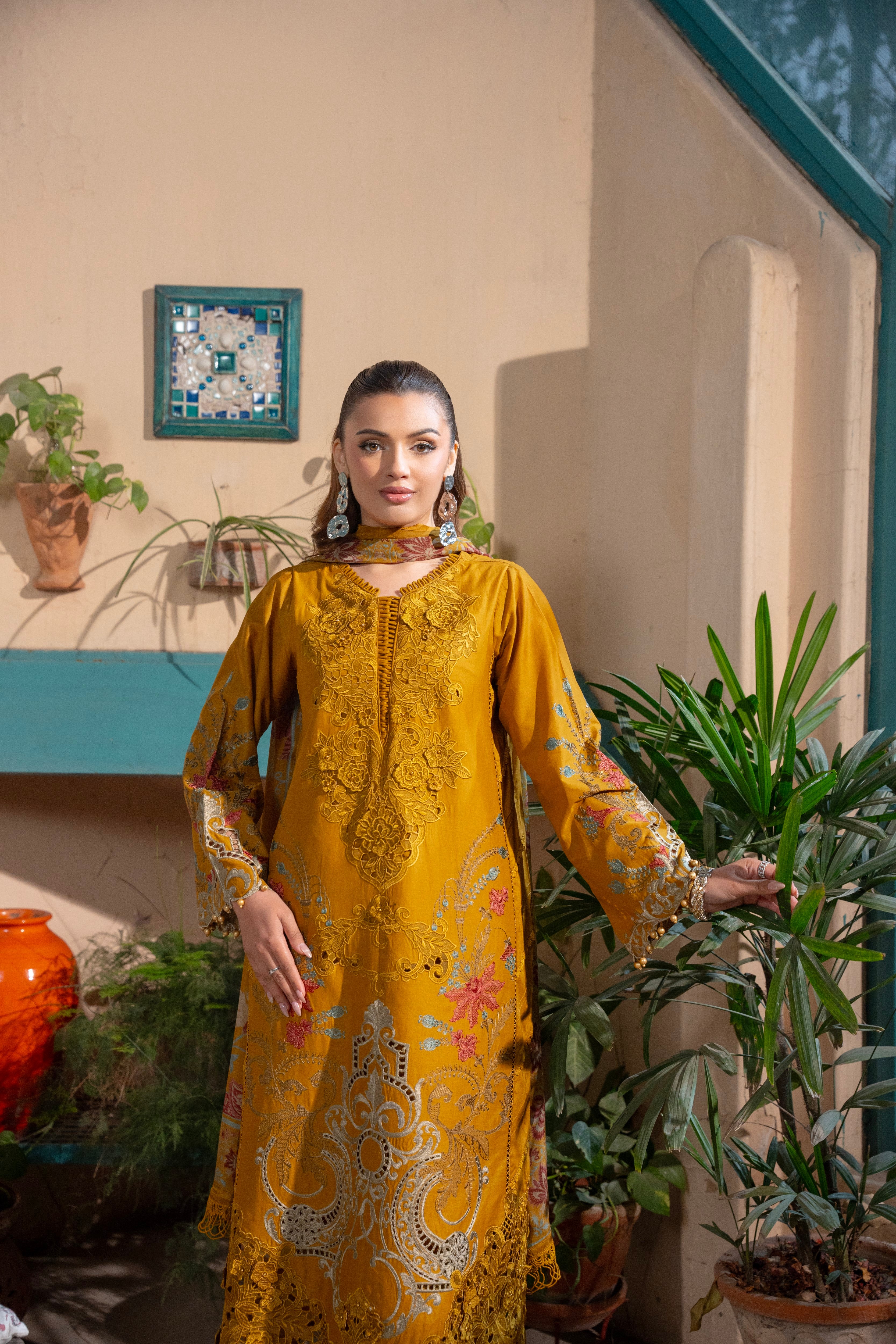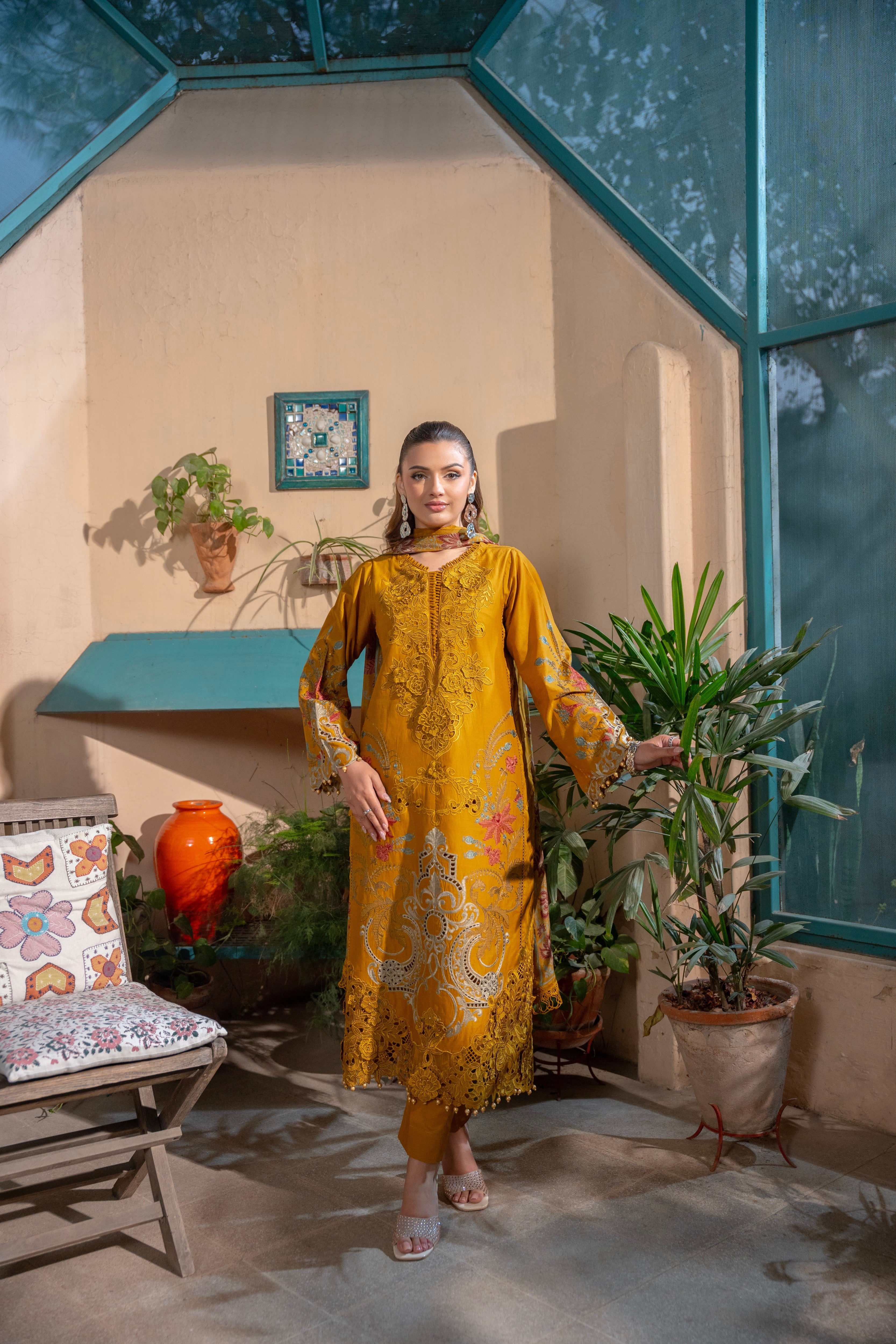 Luxurious 3D Embroidered Ensemble with Pearl Embellishments
