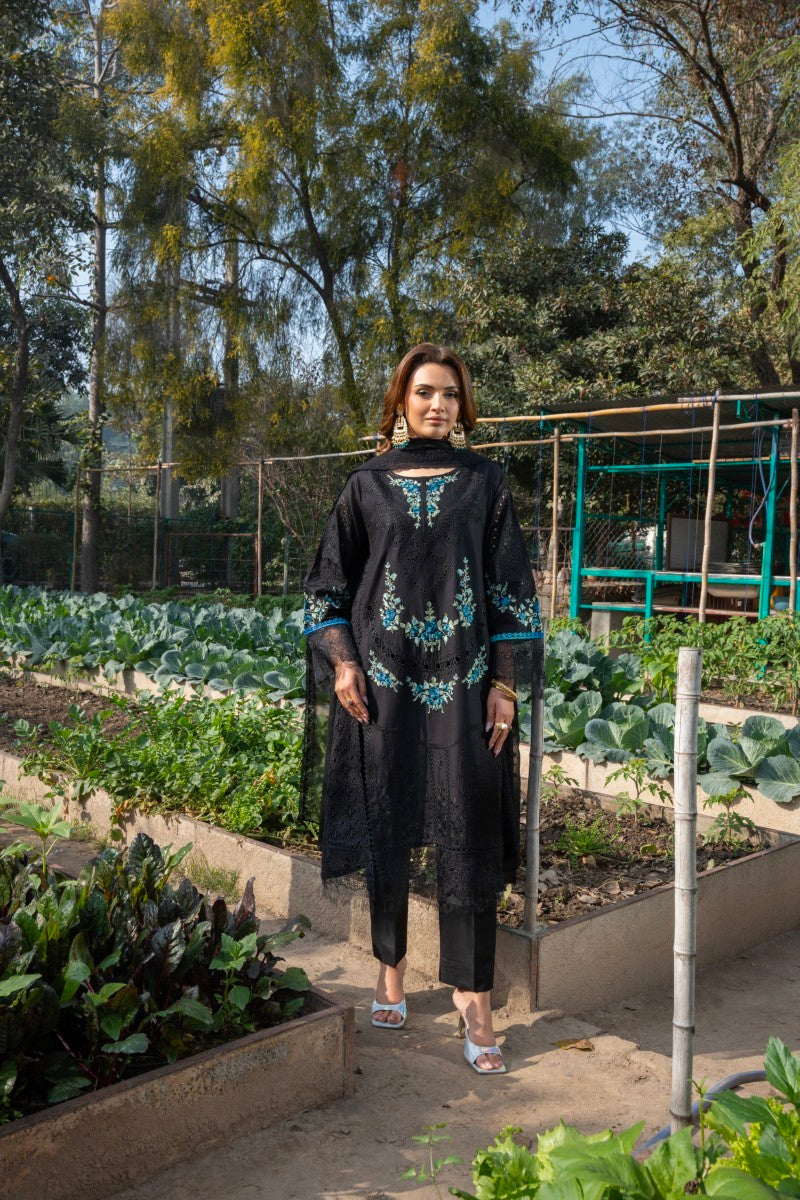 Product Description: Unveil enigmatic charm with Edén, a captivating 3-piece suit in a deep black. This ensemble includes a rich chiffon dupatta with exquisite embroidery on its borders, offering a touch of refined artistry. It is paired with a comfortable plain cotton trouser. The fully embroidered cotton shirt elevates the design, making it a perfect choice for evening wear and special events where you want to make a sophisticated statement.