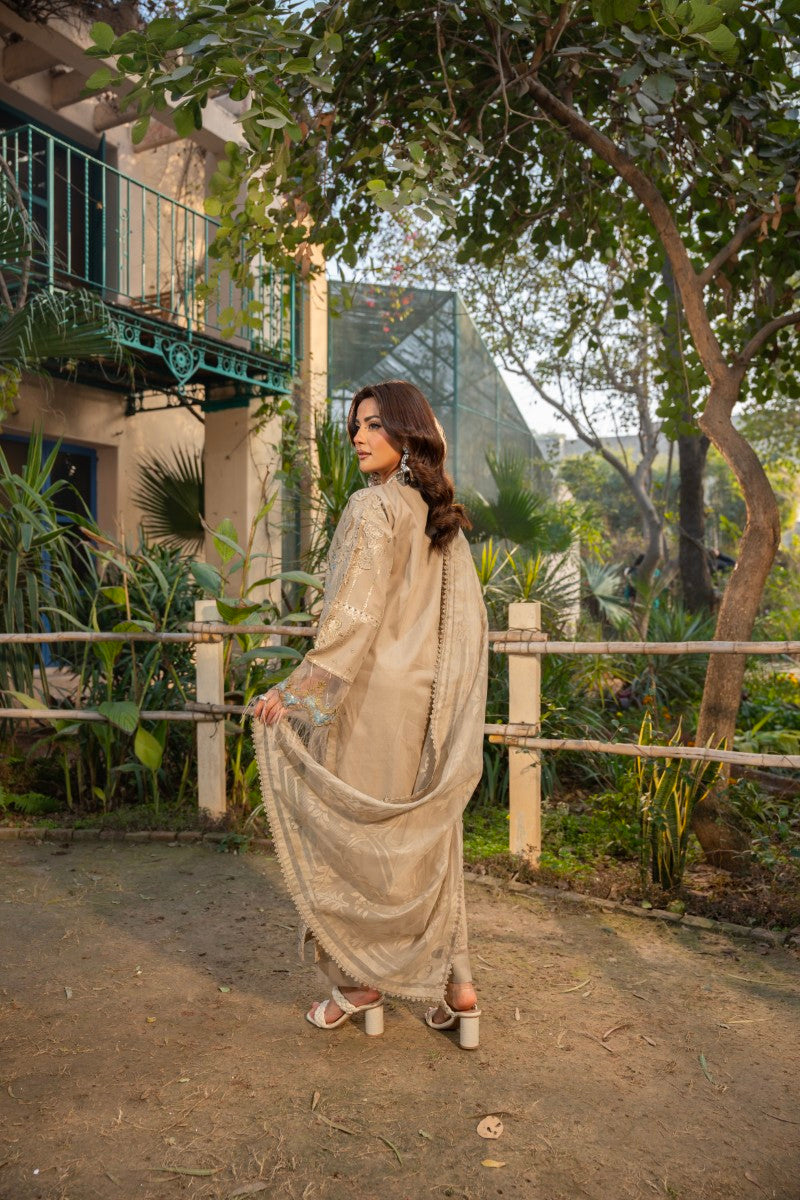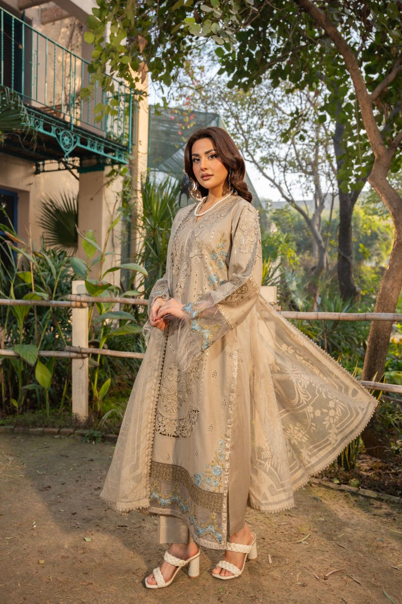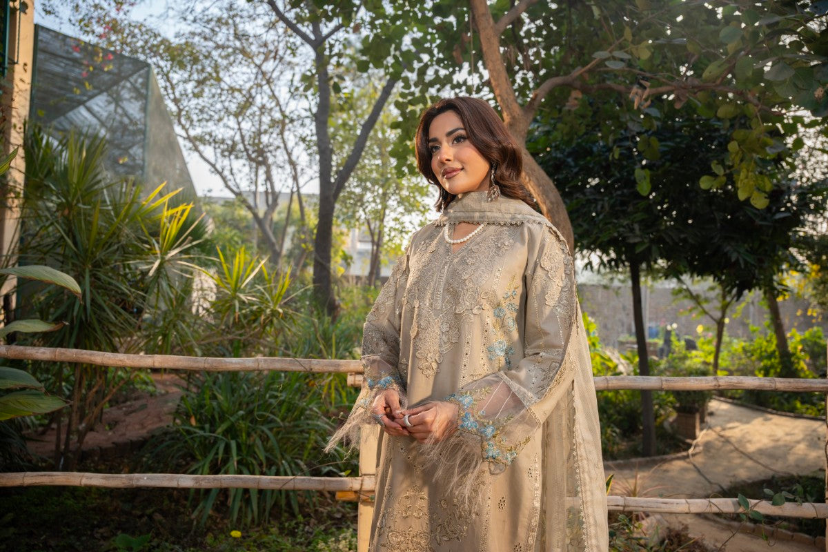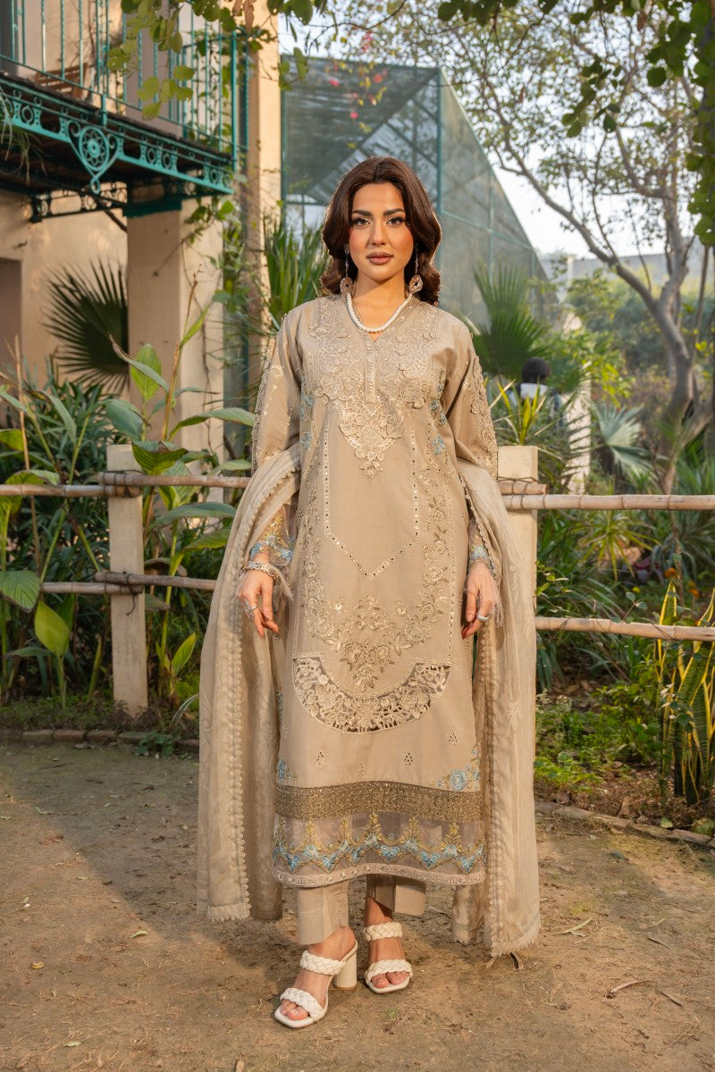 Description: Embrace exquisite charm with Haline, an elegant 3-piece suit designed for memorable events. This ensemble showcases a beautiful cotton net self-print dupatta with intricate lace work on the border, paired with a comfortable plain cotton trouser. The fully embroidered cotton shirt features stunning 3D embroidery work, adding depth and luxurious texture. Perfect for special occasions and sophisticated gatherings.