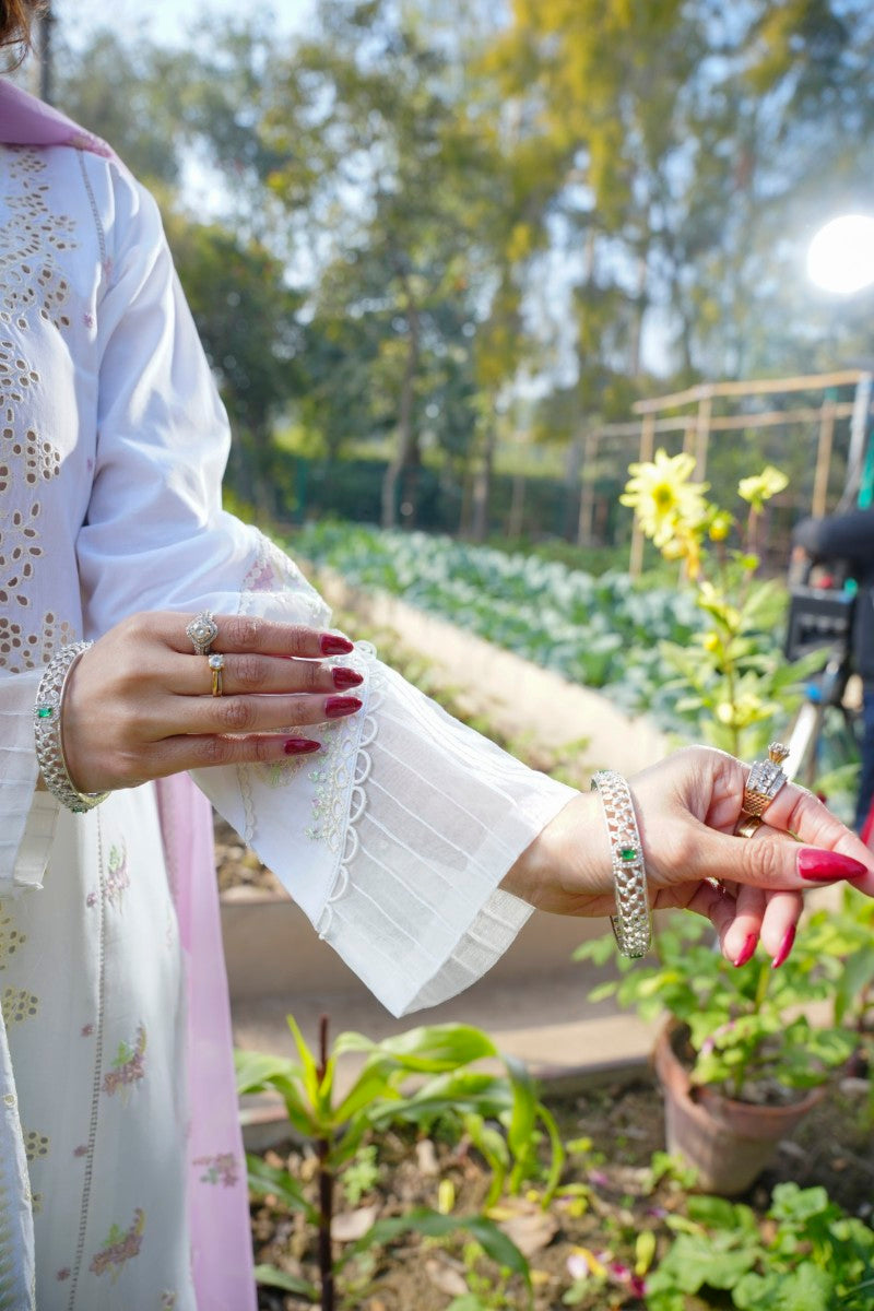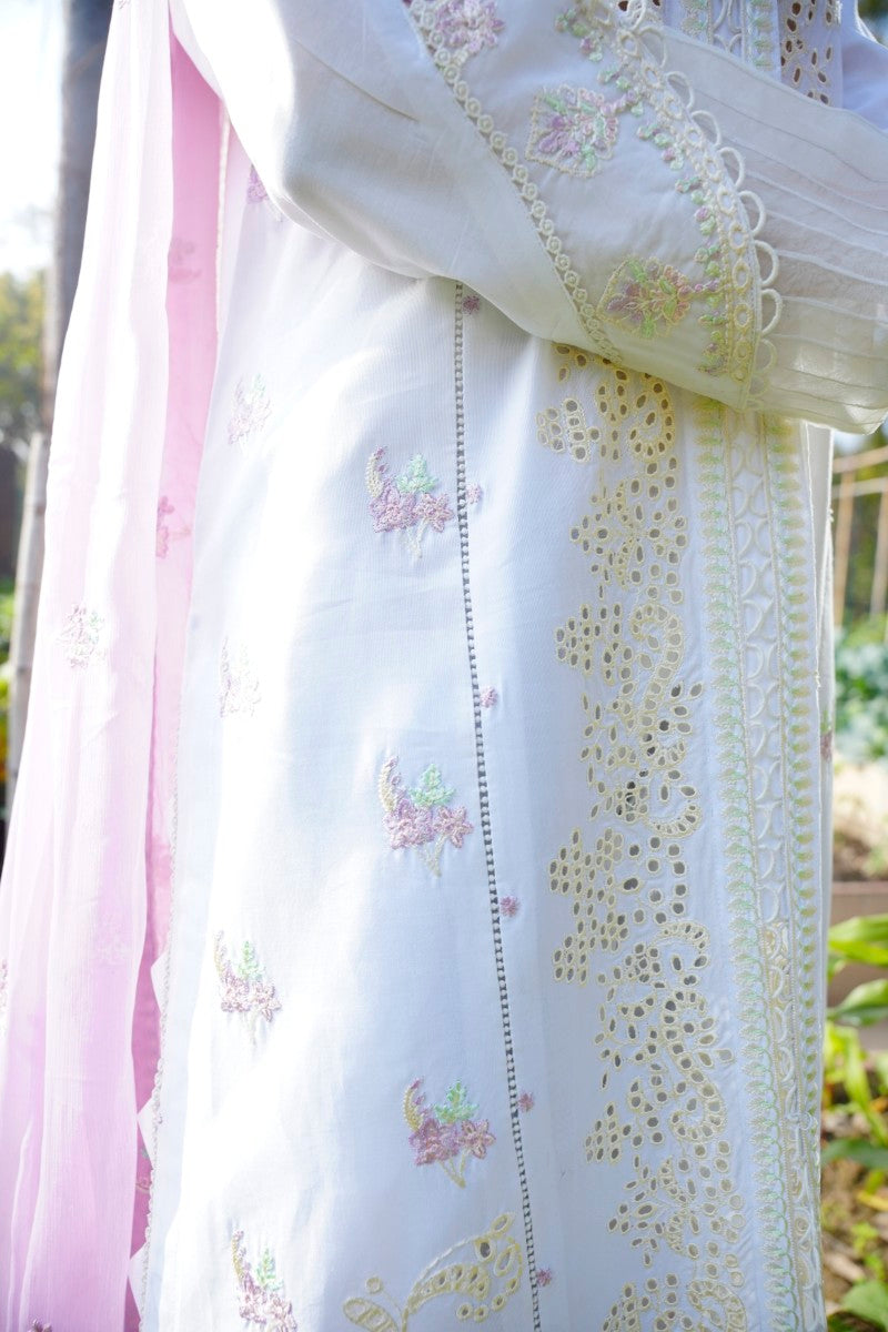 Product Description: Embrace ethereal beauty with Pearline, a graceful 3-piece suit in a delicate white and pink combination. This enchanting ensemble features a chiffon embroidered dupatta, adding a touch of intricate detail. It is paired with a comfortable plain cotton trouser. The fully embroidered shirt, crafted in a charming goon style with elegant stitching, creates a flowing and flattering silhouette. Perfect for daytime gatherings and festive occasions.
