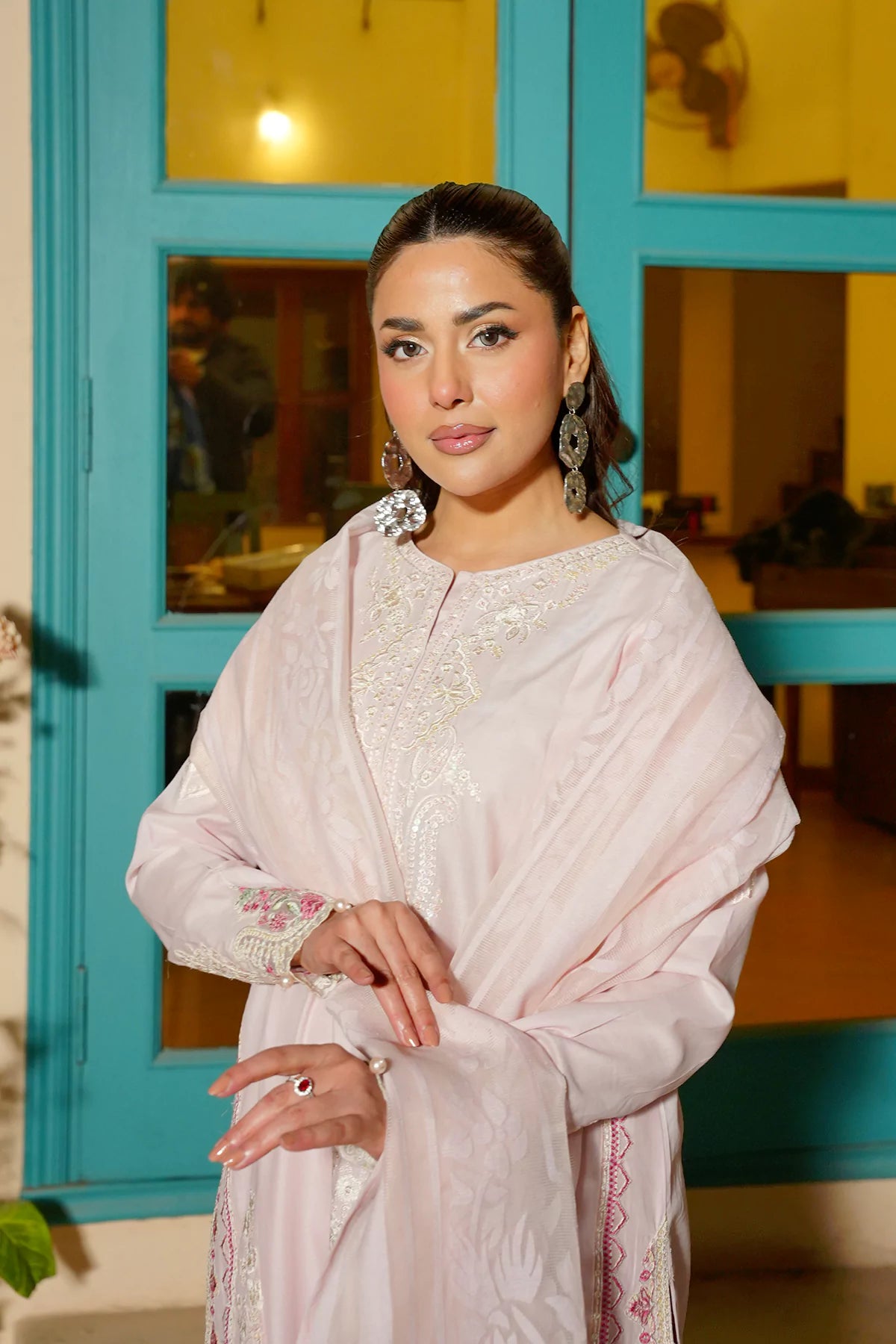 Delicate pearl detailing along the sleeves and borders adds a luxurious finishing touch while maintaining a soft, elegant look.